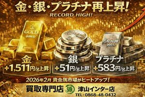 金・プラチナ・銀価格が再び大幅上昇! 買取専門店 源 津山インター店